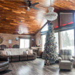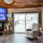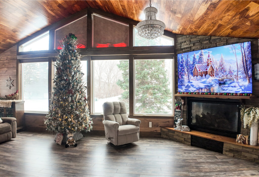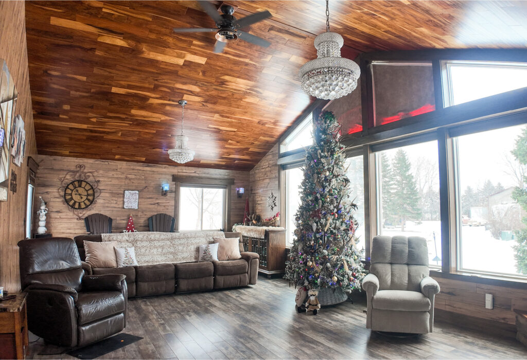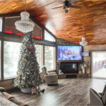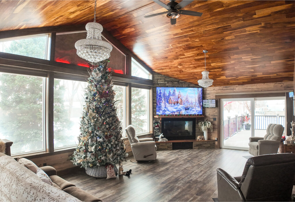 - Vaulted sunroom with a stone-front fireplace, wood ceiling, and floor-to-ceiling windows