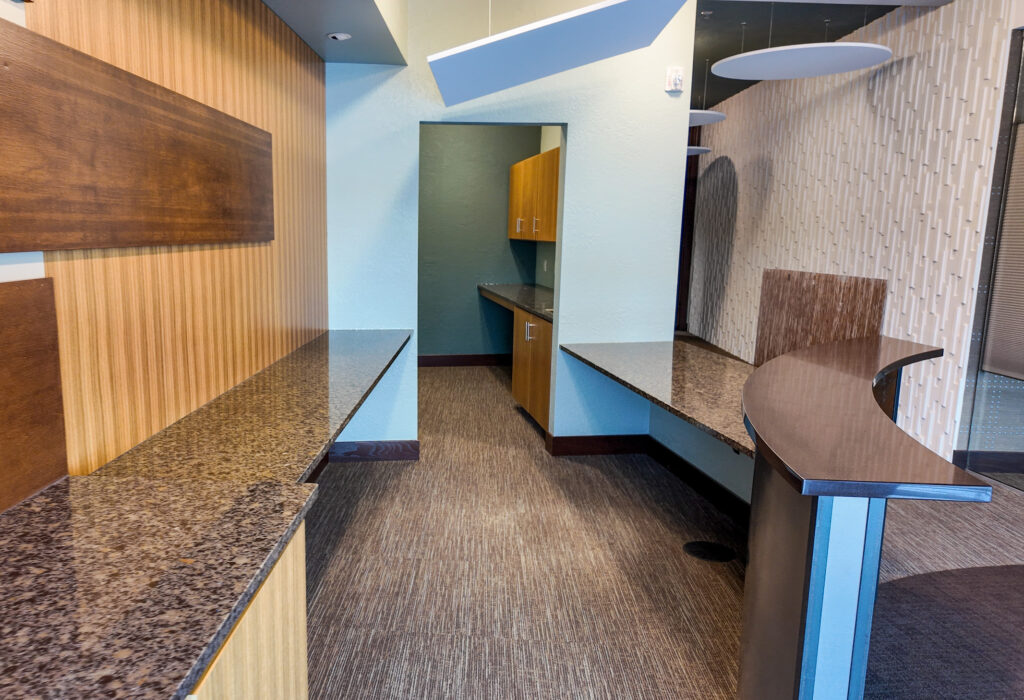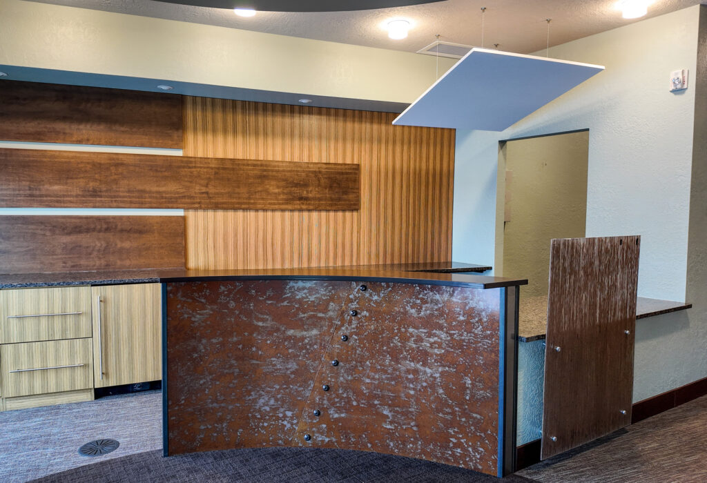 - Floor plan features a reception desk, a large executive office, a small storage area with a sink, and a storage closet