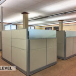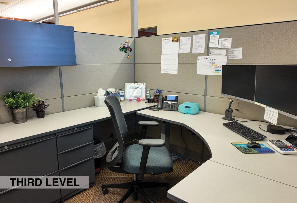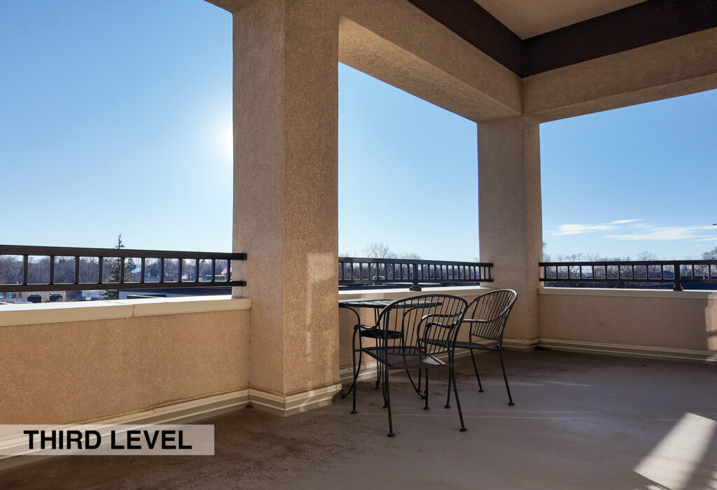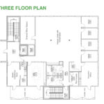 - Level Three Floor Plan: five private offices, one executive office with a patio, executive conference room, open work space (eight cubes), conference room, storage room, and restrooms