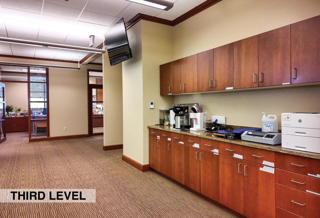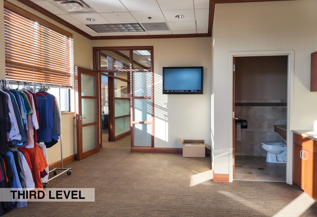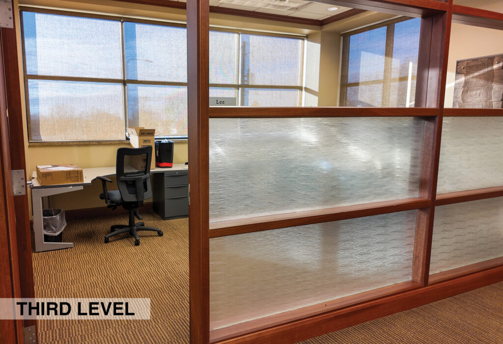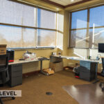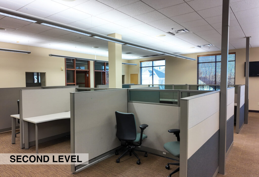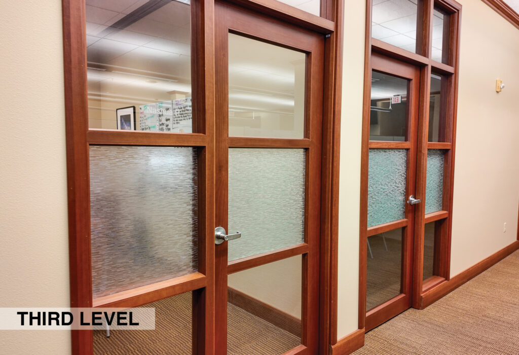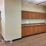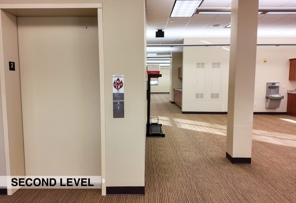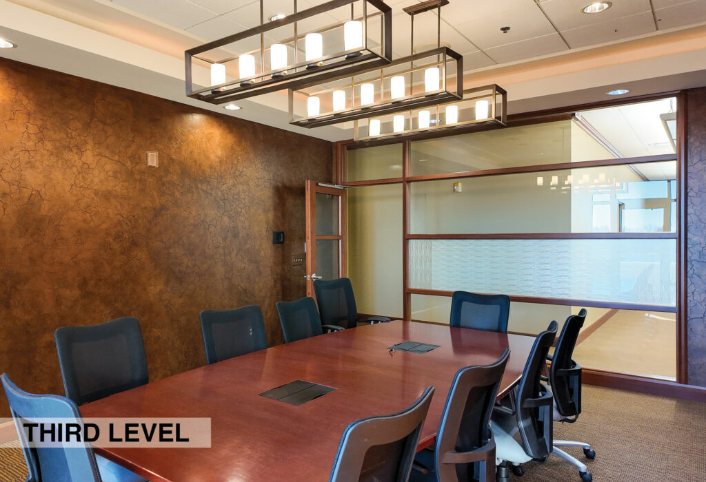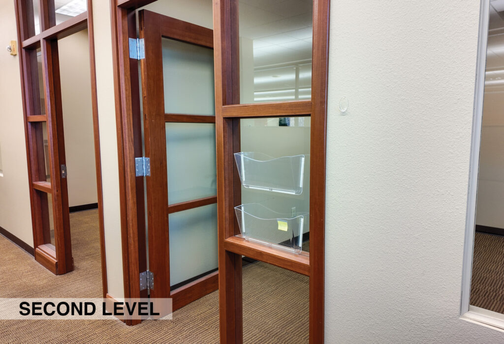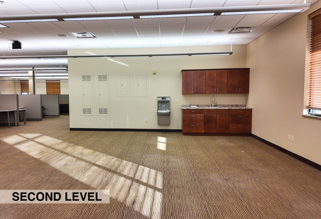 - Level Two Floor Plan: open work space, two private offices, conference room, restrooms, and built-in cabinetry (with a sink and drinking fountain)