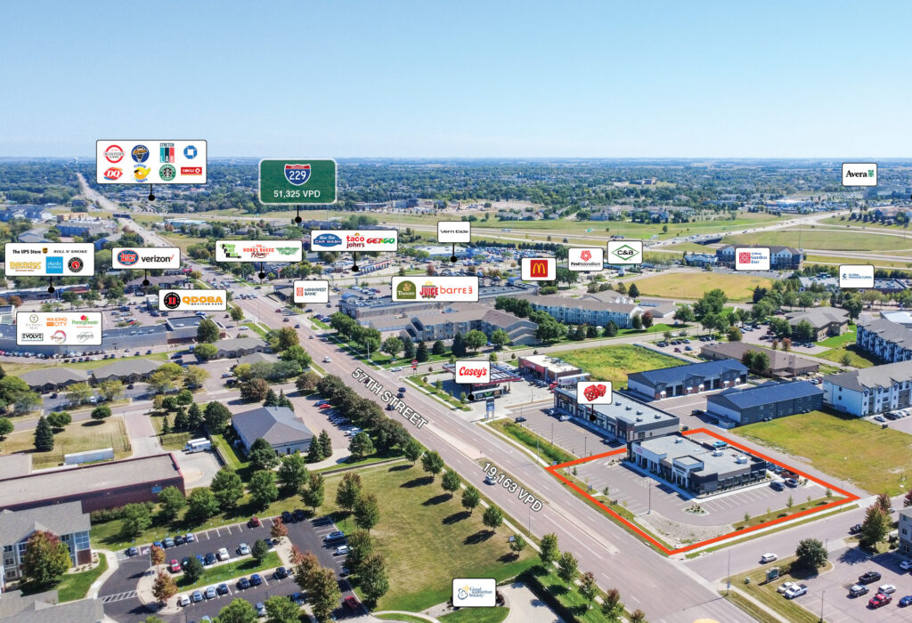 Office and/or retail space available on 57th Street with traffic counts of 19,163 per day. The site offers seamless access to I-229 and I-29, connecting the property to all major city corridors. The surrounding area includes a healthy mix of national retailers, fitness, and dining options including Great Life, McDonald's, Panera, Casey’s, and more. Co-tenants Papa Murphy’s and Highest Health Chiropractic draw daily foot traffic, and proximity to major regional destinations like Empire Mall, Avera Heart Hospital, and Sertoma Park adds long-term value.