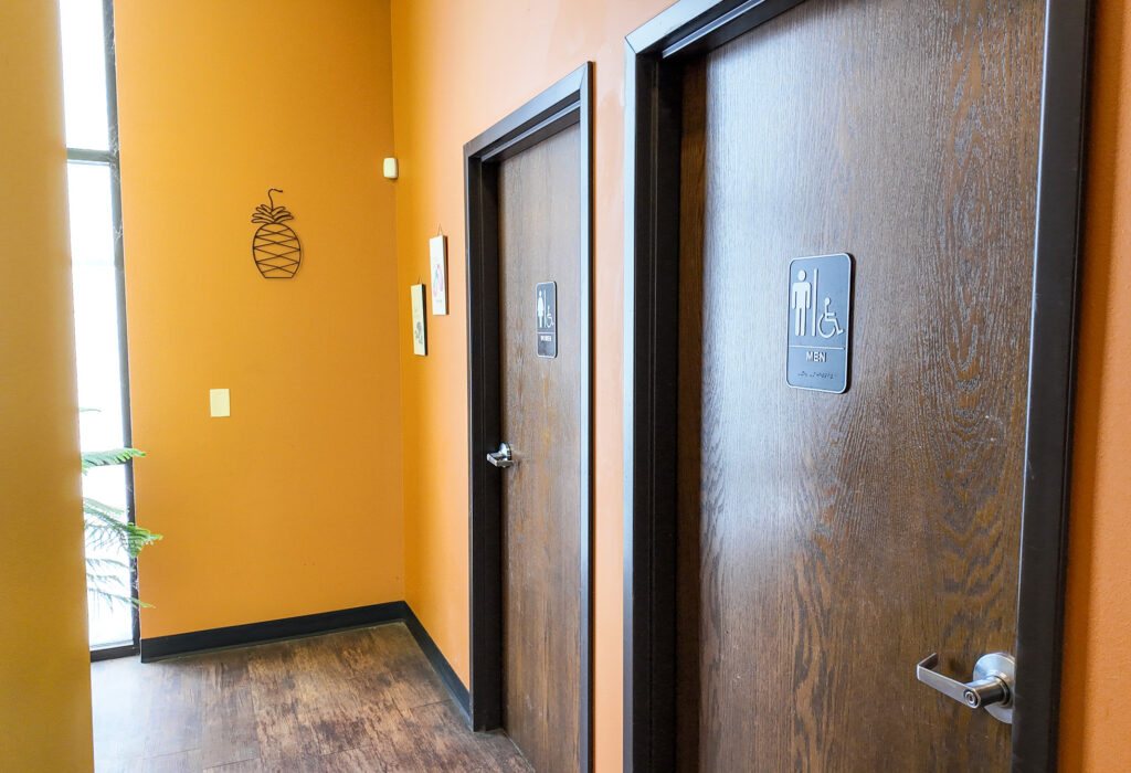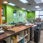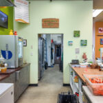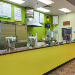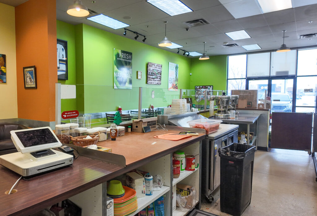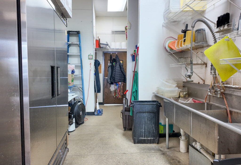 - Efficient open layout with a long front counter featuring forward-facing prep space, flexible seating area, mens and womens restrooms, a utility closet, and back-of-house space with multiple sinks, storage, and refrigeration