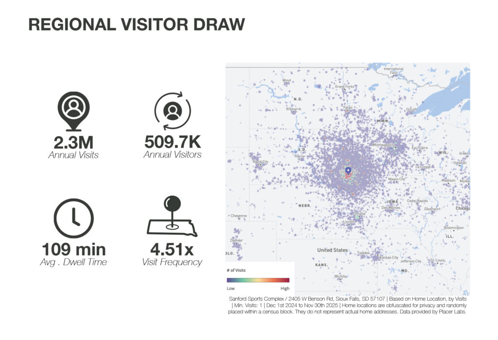 The Sanford Sports Complex is located in Sioux Falls, South Dakota, directly off Interstates-29 and -90. It offers seamless connectivity for visitors and commuters, enhancing its draw as a regional hub for sports and recreation. Its campus style layout supports year-round activity driven by tournaments, events, training programs, and daily visitation. Additionally, the complex is conveniently located just a short drive from the Sioux Falls Regional Airport, making it easily accessible for out-of-town visitors and facilitating smooth travel logistics for events and tournaments hosted at the venue.