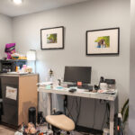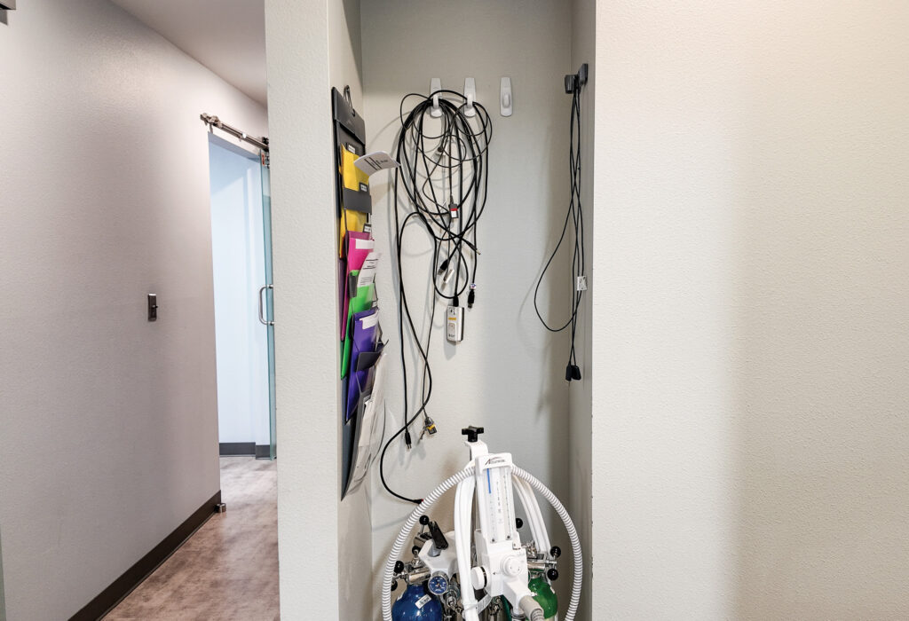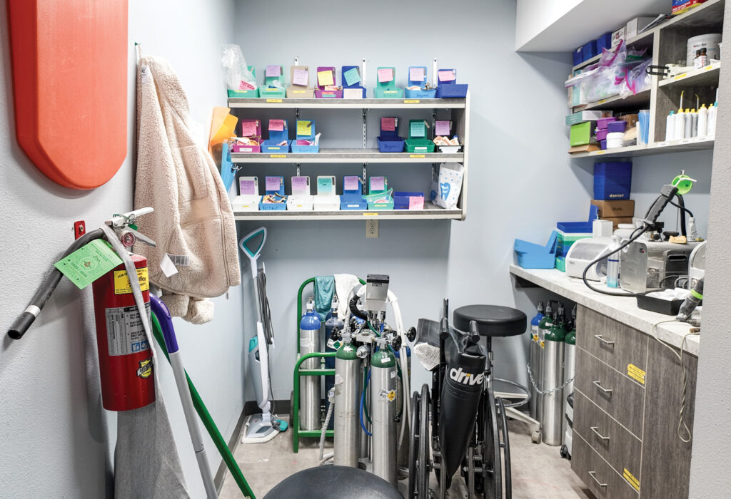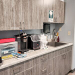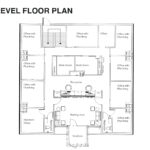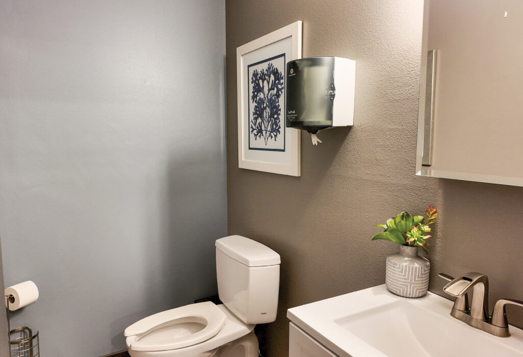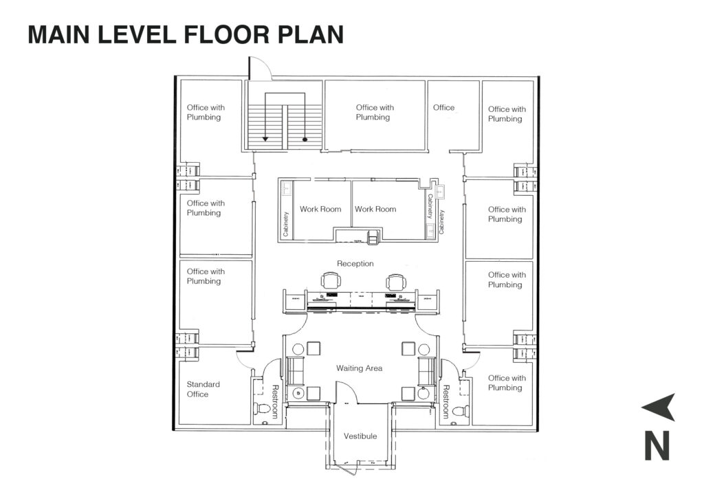 - Main level floor plan includes a waiting room, reception desk, 8 offices with plumbing, 1 standard office, 2 single restrooms, and two storage or work rooms (2,318 SF +/-)