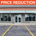 - Floor plan offers a vestibule entry, large open showroom, one office, ample storage space, a utility room with storage shelves, utility closet with a sink, and restrooms
